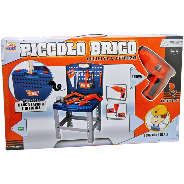 Banco da lavoro che si richiude a valigetta ricco di attrezzi, sega, cacciavite, tenaglia e tanti altri. Incluso anche un trapano funzionante a batteria con regolatore di rotazione.