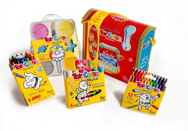 Contiene: plastilina 6 colori, 12 pastelli a cera, 6 pennarelli Jumbo, 6 maxi acquerelli.
